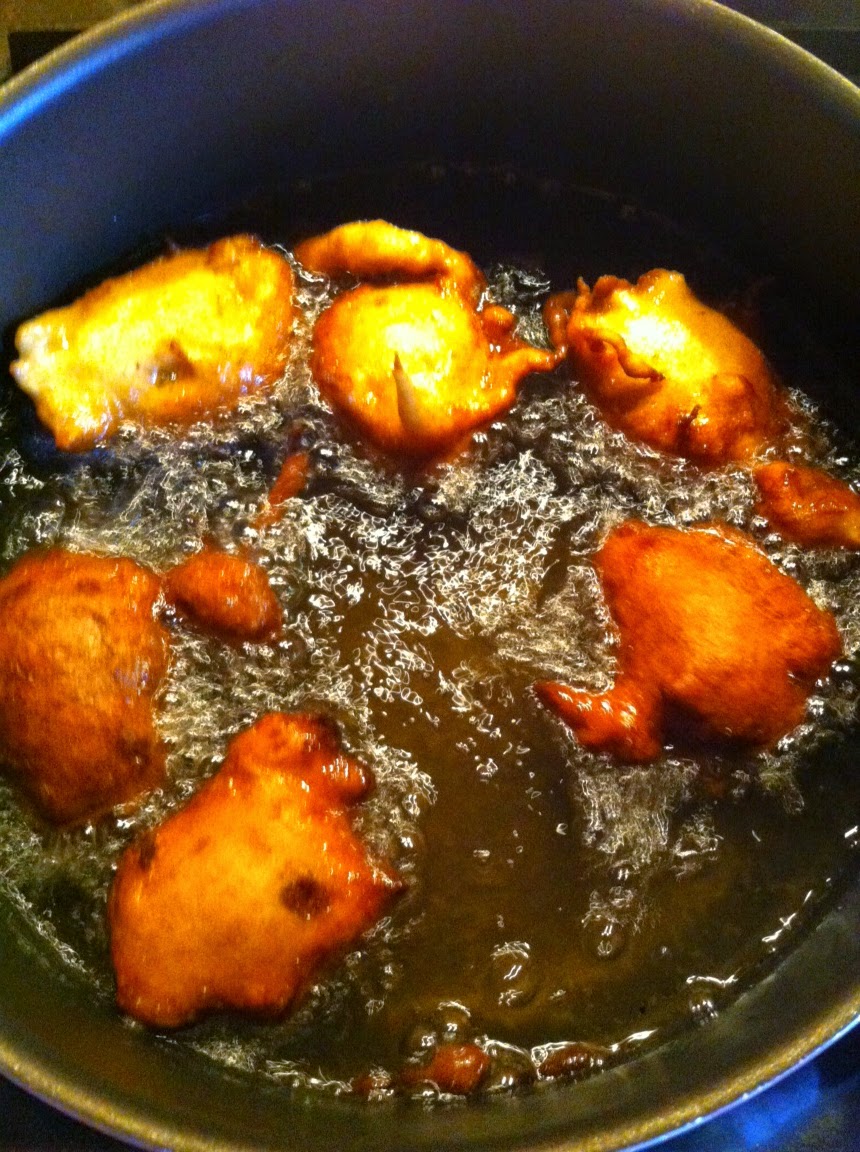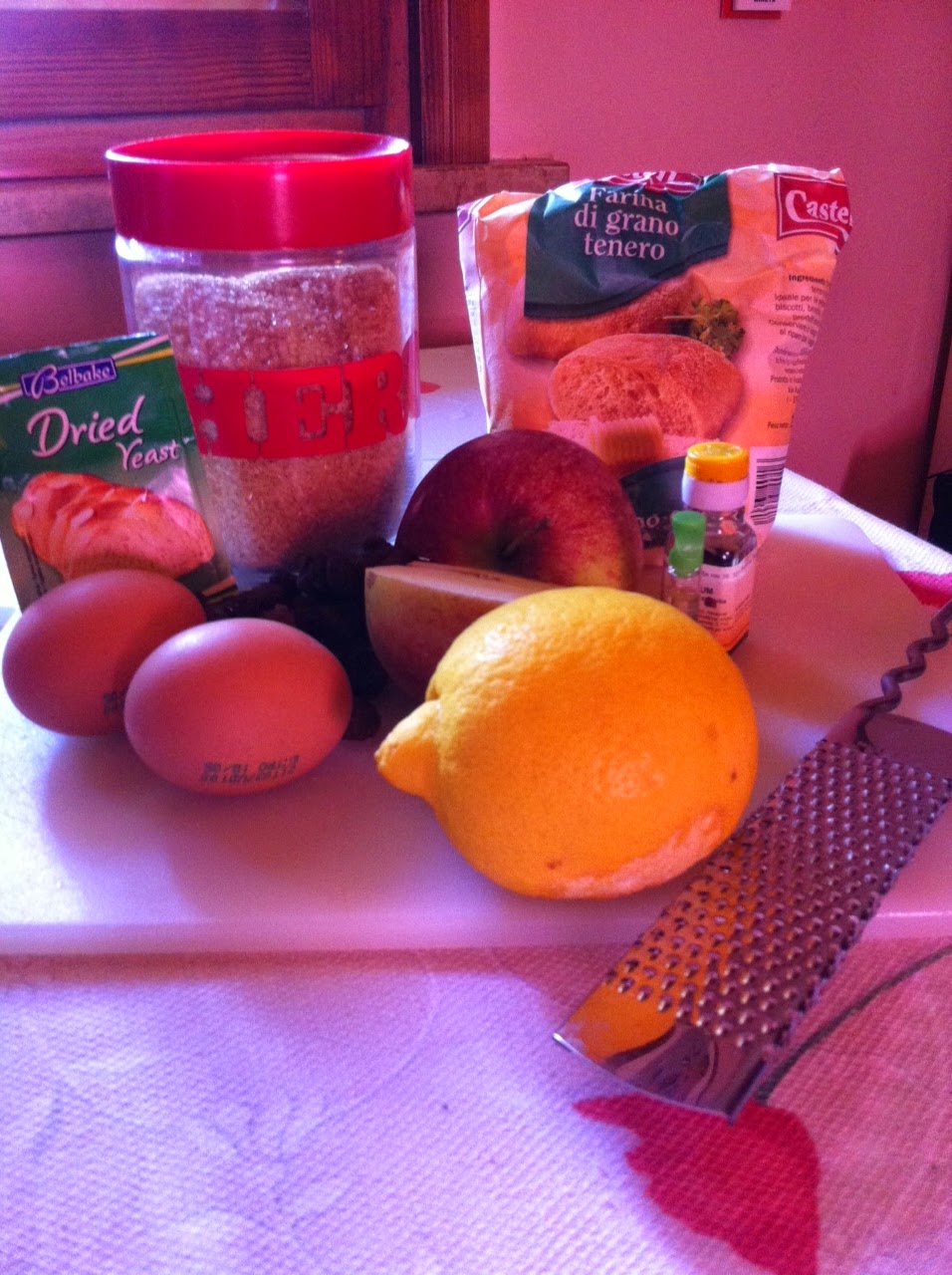 2 uova, 4 cucchiai di zucchero di canna, mezza mela grande grattugiata o una mela piccola, farina 00 q.b., 3,5 gr lievito di birra secco (mezza bustina da 7 gr), buccia grattugiata di mezzo limone, mezza fialetta di estratto di limone, 2 cucchiai di rhum per dolci, una bella manciata di uvetta (precedentemente fatta ammollare in acqua e poi strizzata e infarinata in modo che non cada in fondo all’impasto), un pizzico di sale, 1 cucchiaio di olio non saporito, olio di semi di arachidi per friggere.