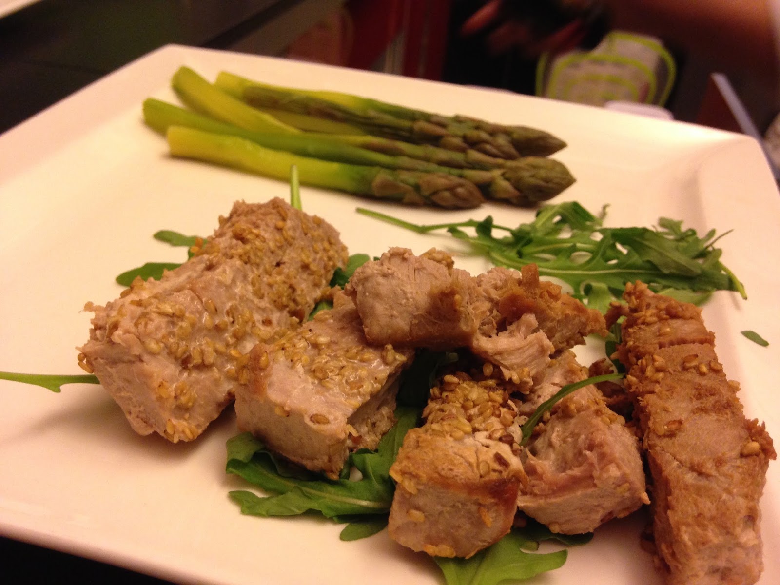 Asparagi Verdi, Pistacchi, Tagliata di Tonno ai Semi di Sesamo Bianchi su Letto di Rucola, Purè, Riso Venere e Pistacchi