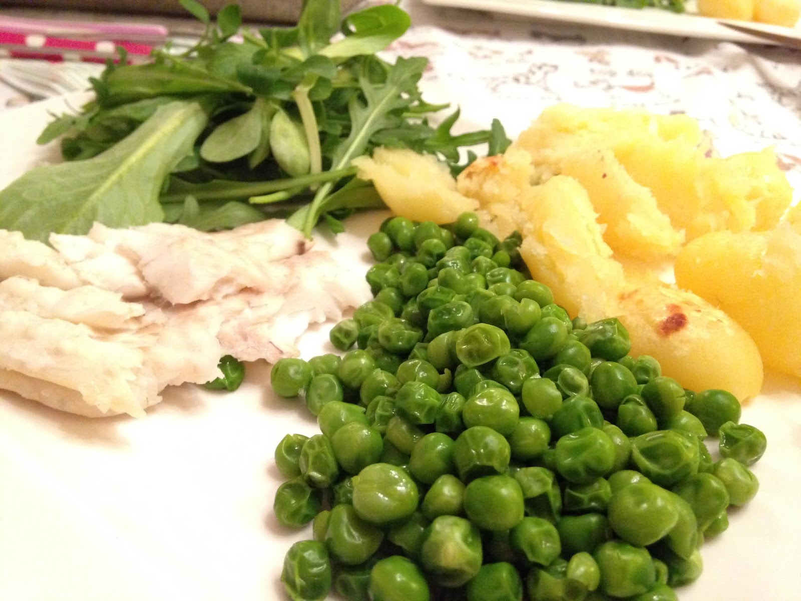 Branzino al Forno con Piselli, Patate e Insalata Mista