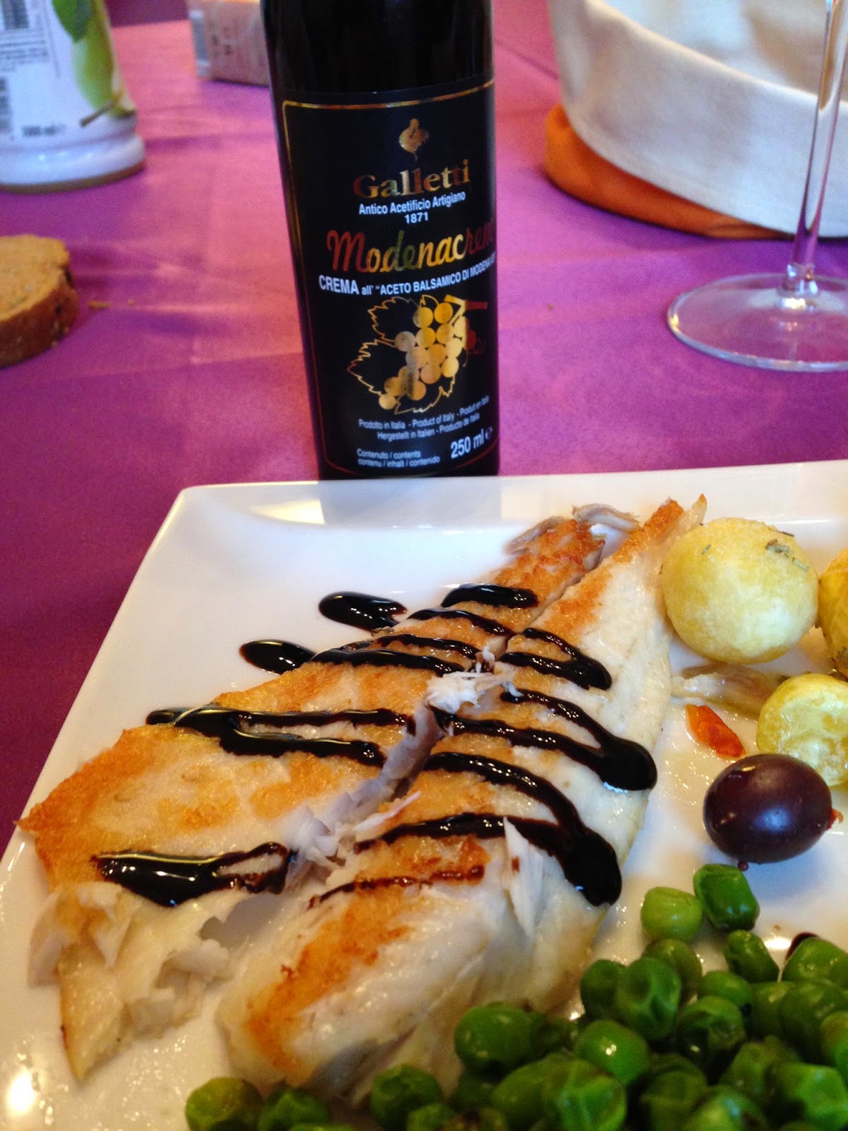 3 filetti di branzino, polipo, patate novelle e pisellini congelati, olio, sale, rosmarino, brodo vegetale, qualche pomodorino, qualche oliva nera, 1 cucchiaio di aceto (io ho utilizzato il Condimento agrodolce in bottiglia “Rossini” Oro di Modena di Galletti), crema di aceto balsamico (io ho utilizzato la Crema all’aceto balsamico di Modena I.G.P. ModenaCrèam di Galletti).